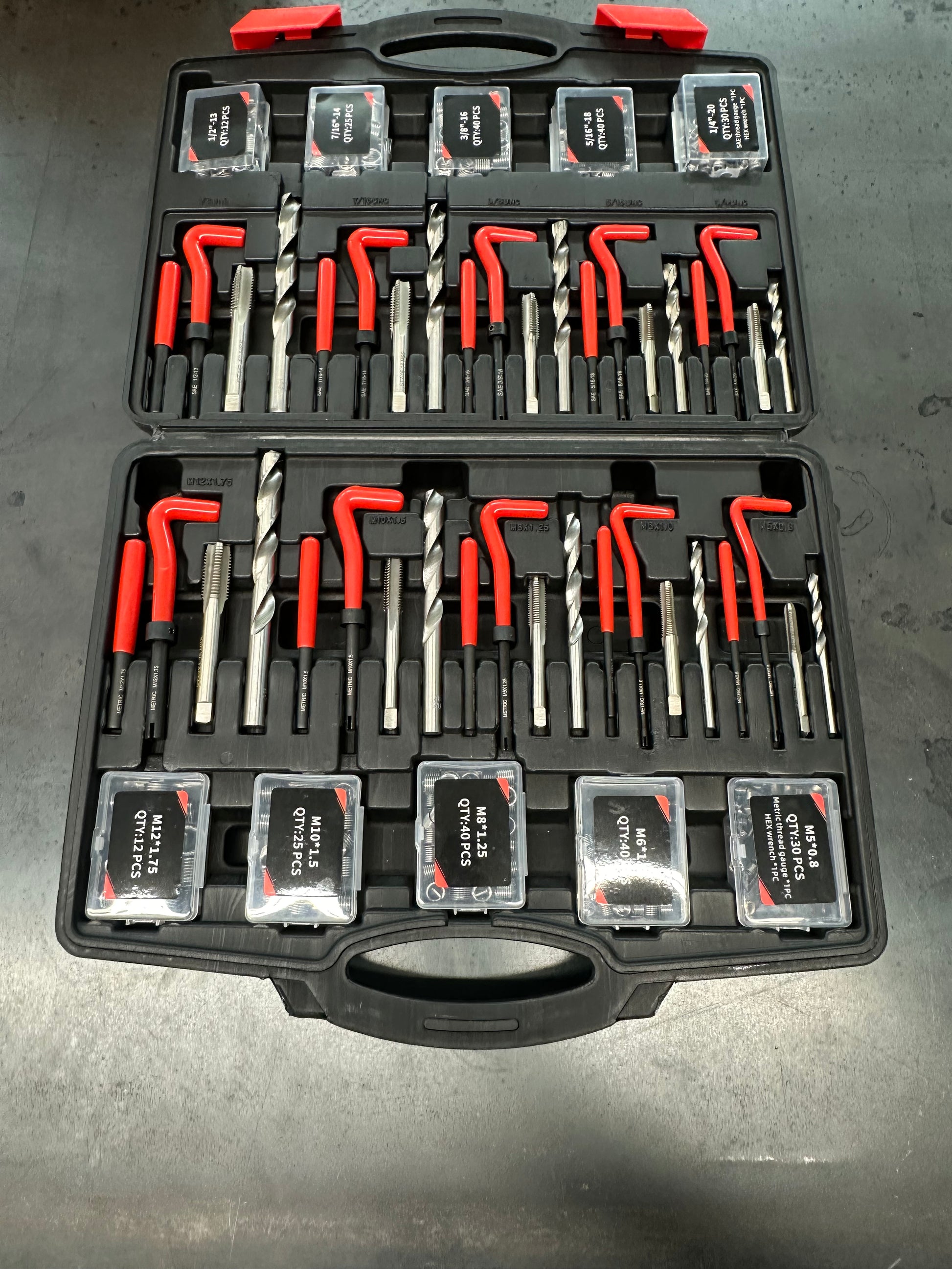 5x Twist Drill Bits / 5x Break Pin Tools / 5x Installation Tools / 1x Hex Key / 5x Taps / 1x Storage Case 110x Wire Thread Inserts M5 x 0.8 x 6.7mm / M6 x 1.0 x 8.0mm / M8 x 1.25 x 10.8mm / M10 x 1.5 x 13.5mm / M12 x 1.75 x 16.3mm